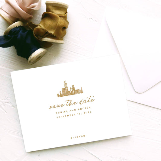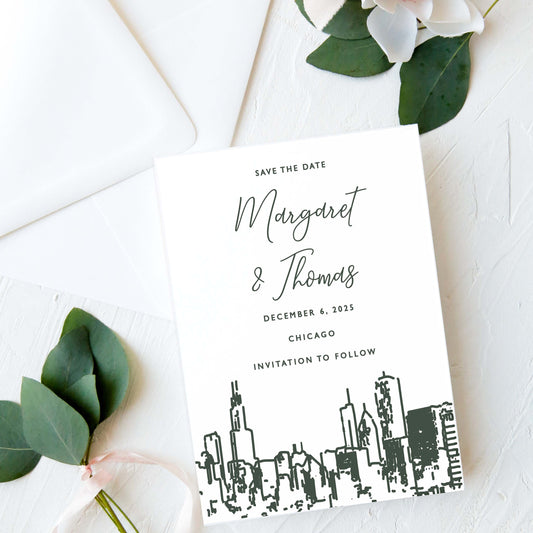 Chicago Skyline Save the Date Card and Envelope