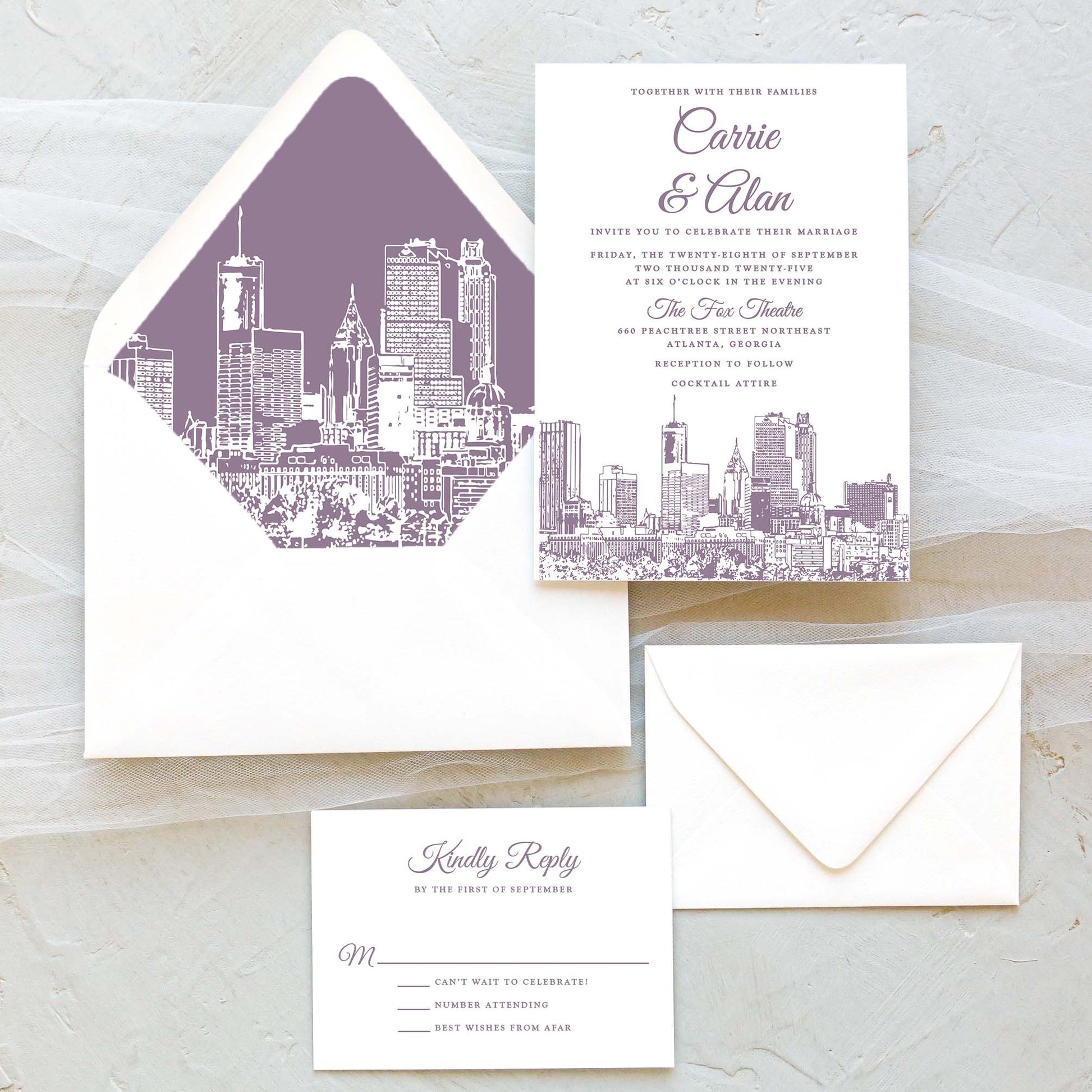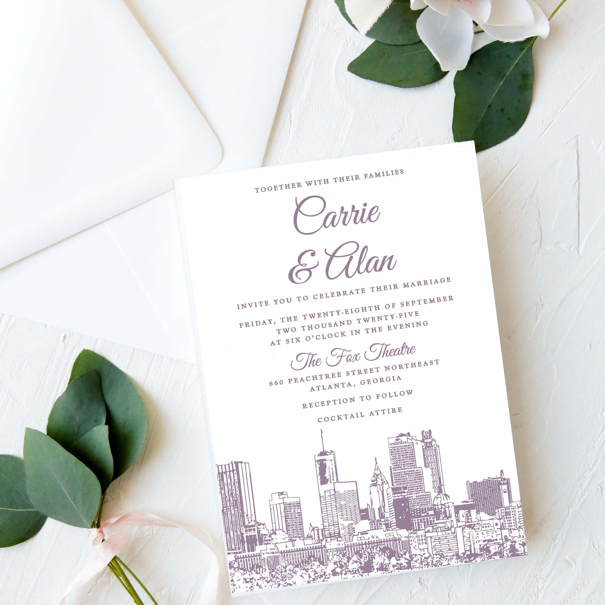 This Atlanta, Georgia wedding invitation features a stunning skyline design to set the tone for your special day. Impress your guests and showcase your love for the city in a charming and elegant way. The Atlanta invitation suite can be customized with your colors and font choices to be a unique touch to your wedding theme.