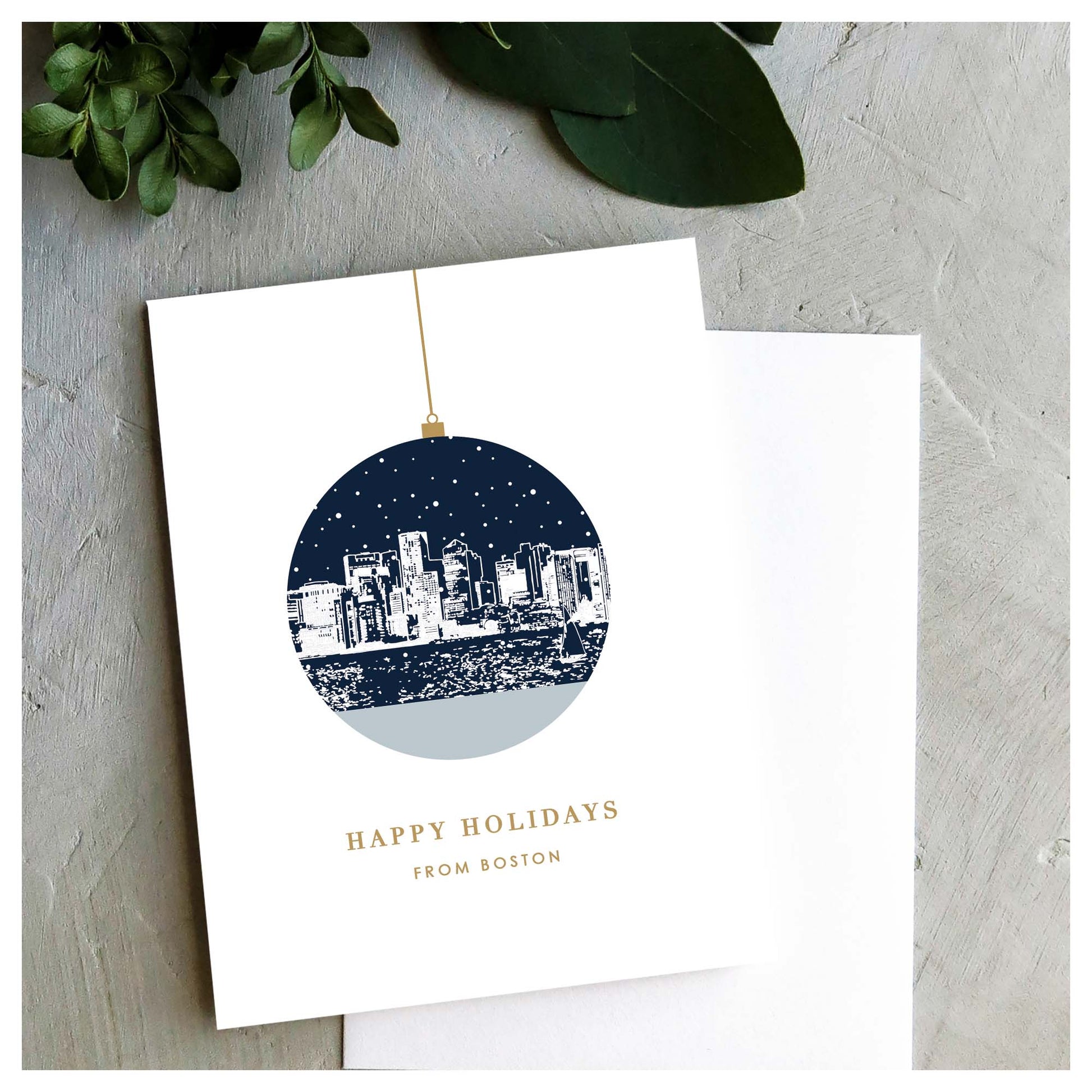 Show off your hometown as you share holiday wishes to clients, friends or family. Elegant and classic, these ornament skyline holiday cards are perfect for professional or personal use.