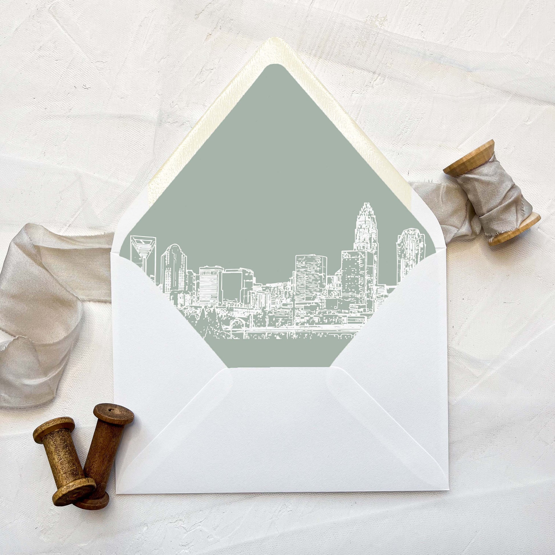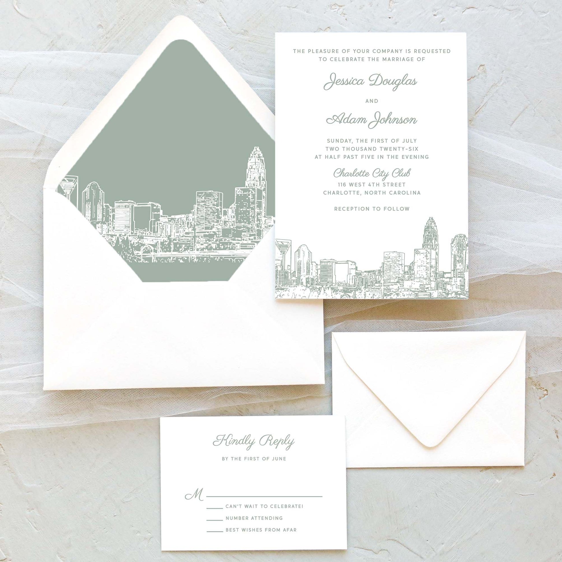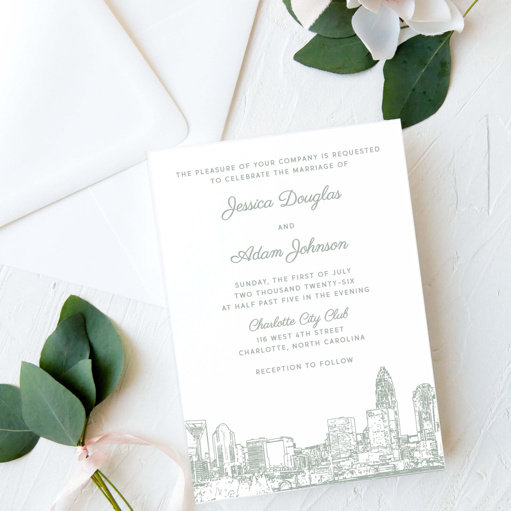 This Charlotte, North Carolina wedding invitation features a stunning skyline design to set the tone for your special day. Impress your guests and showcase your love for the city in a charming and elegant way. The Charlotte invitation suite can be customized with your colors and font choices to be a unique touch to your wedding theme.