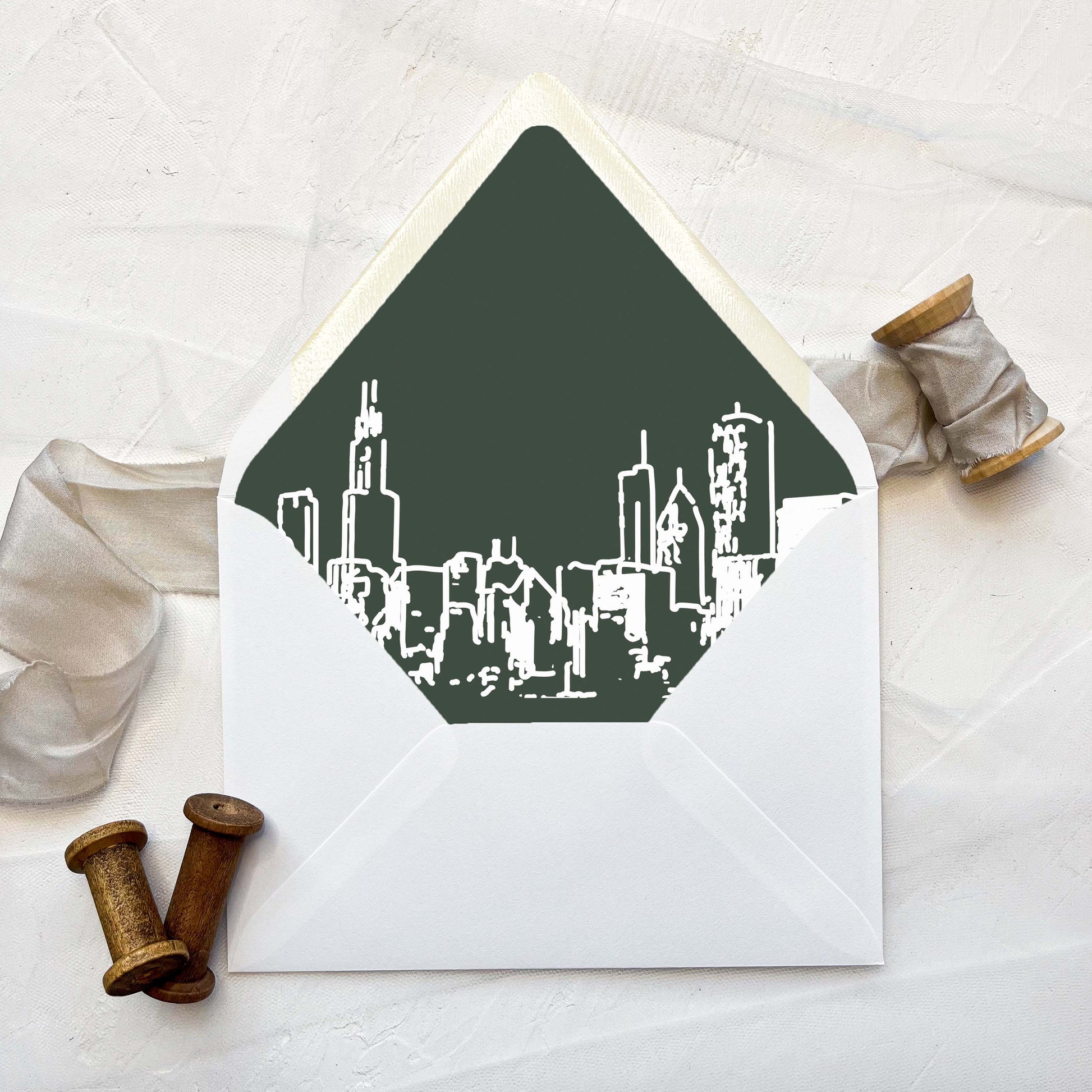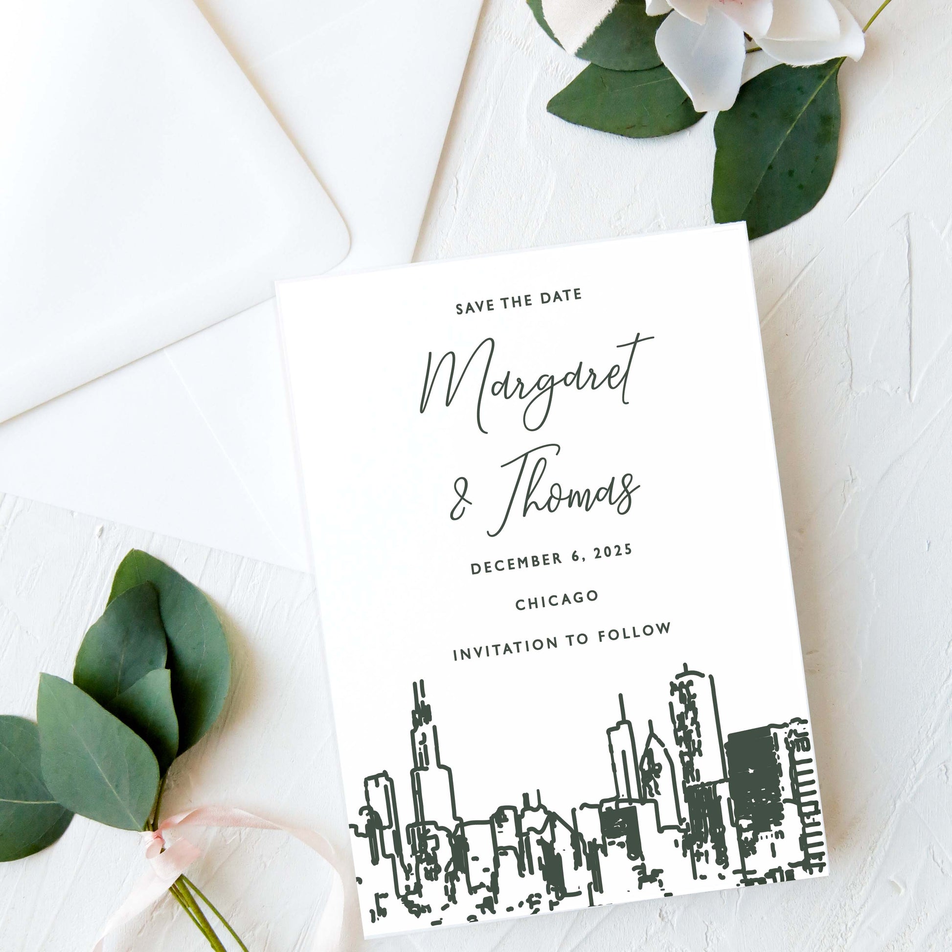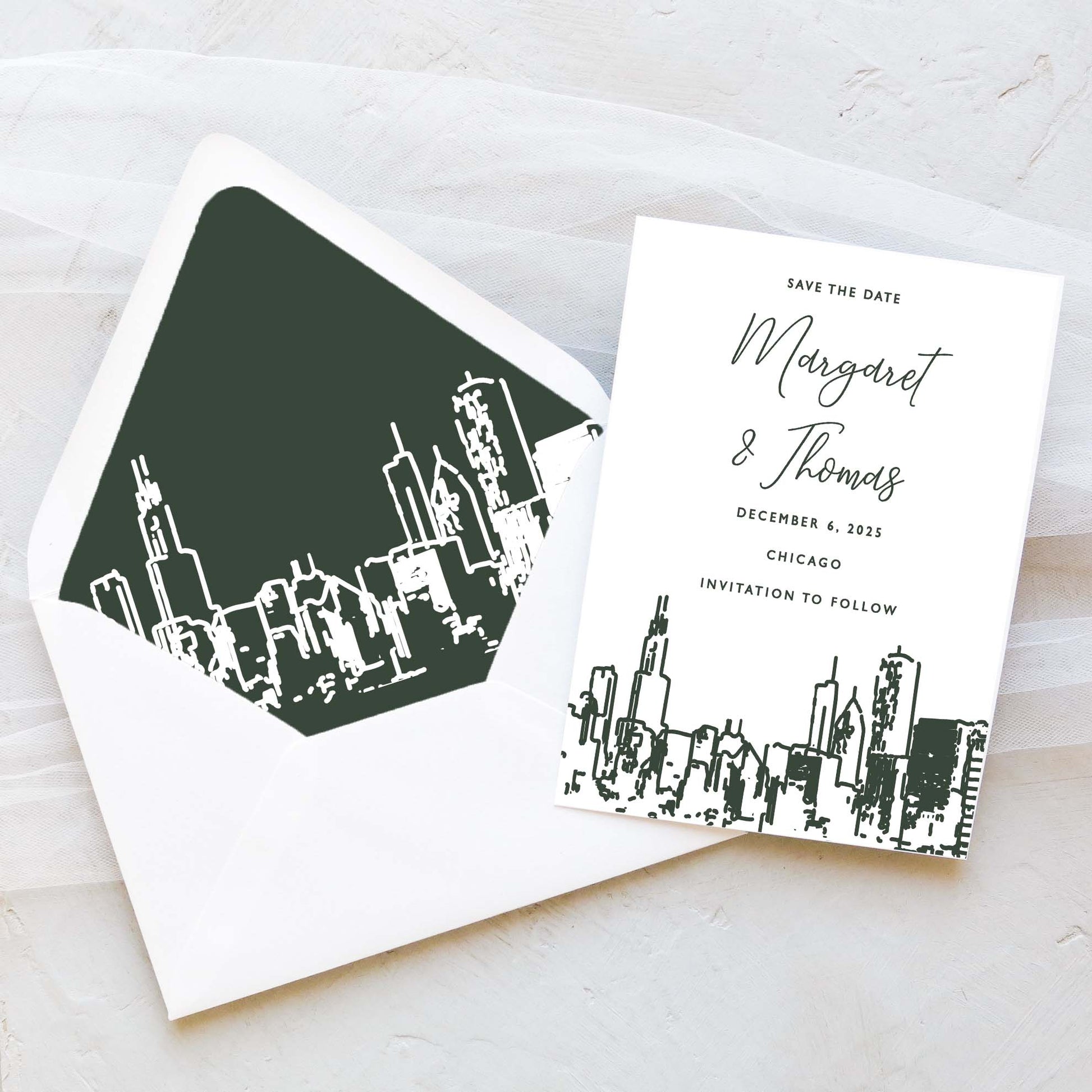 Invite your loved ones to share your celebration in the city you love with our Chicago line art save the date card. Featuring the iconic Chicago skyline, our simple, elegant design creates a timeless connection to this special city.