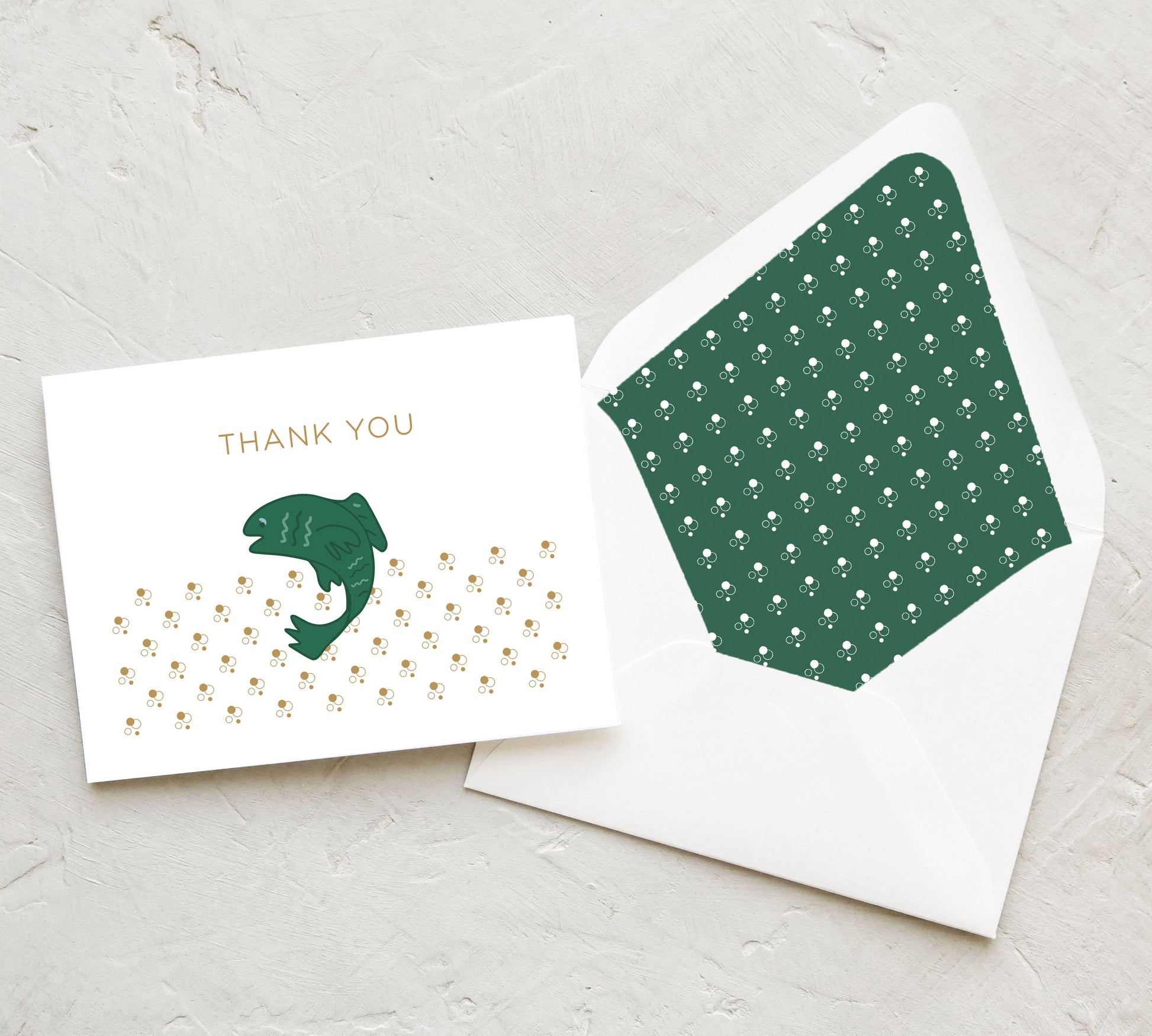 Enhance your thank you notes with this mesmerizing fish in bubbles design. Each card showcases a fish in bubbles illustration, adding a magical, under-the-sea feel to every message. The interior of the card is empty, providing ample room for your personal note. Optional envelope liners are also available to elevate your stationery set.