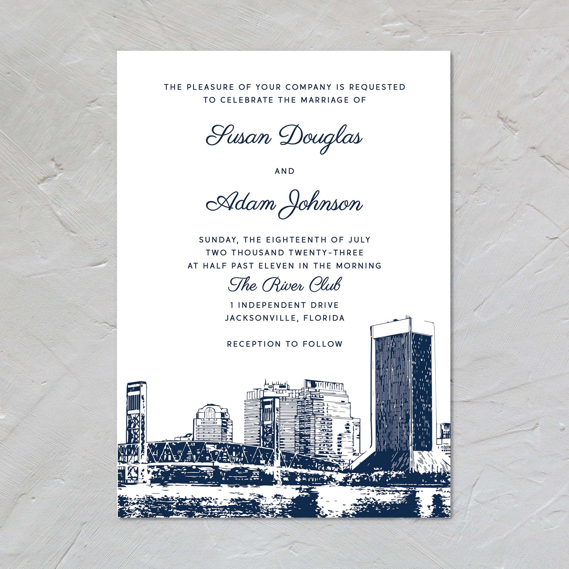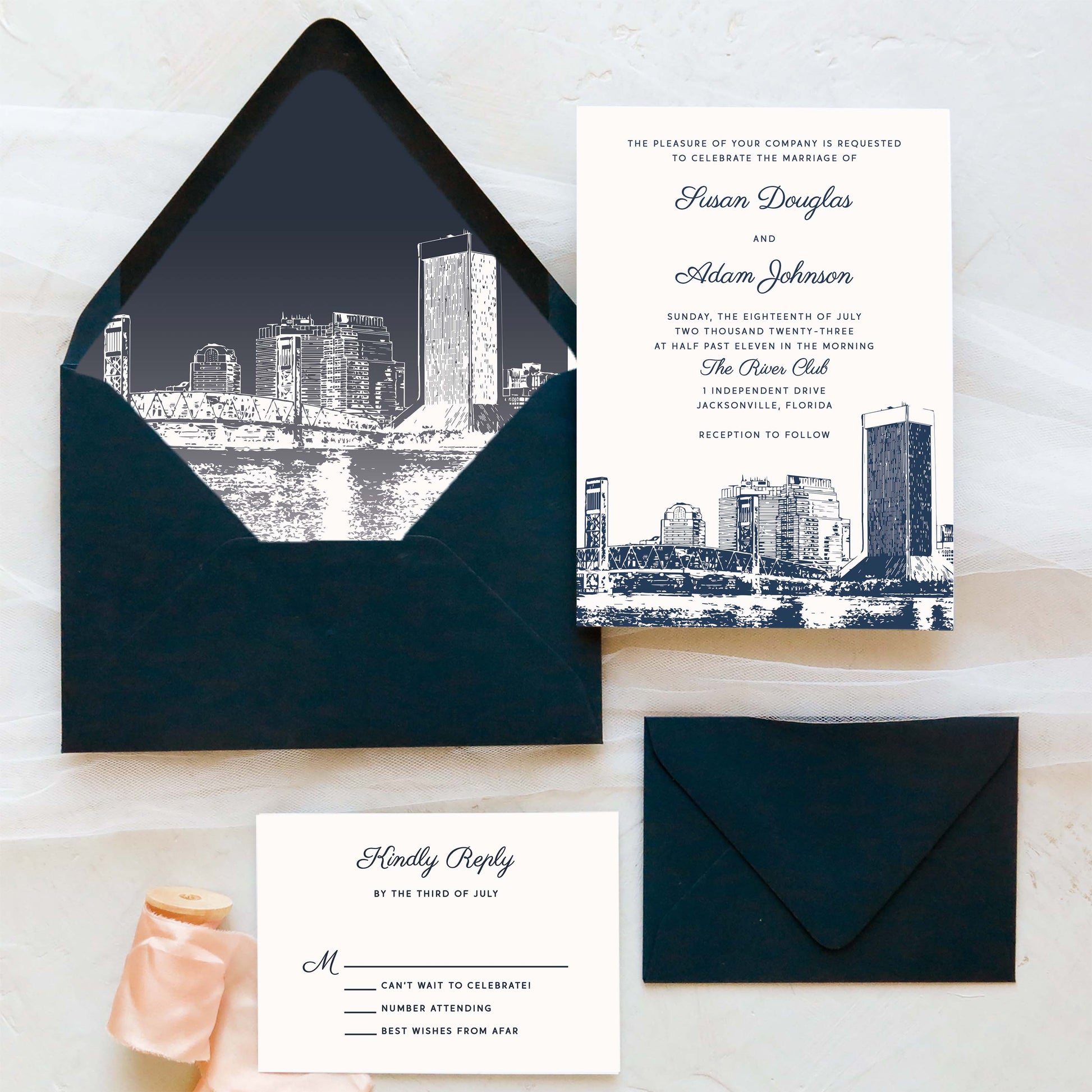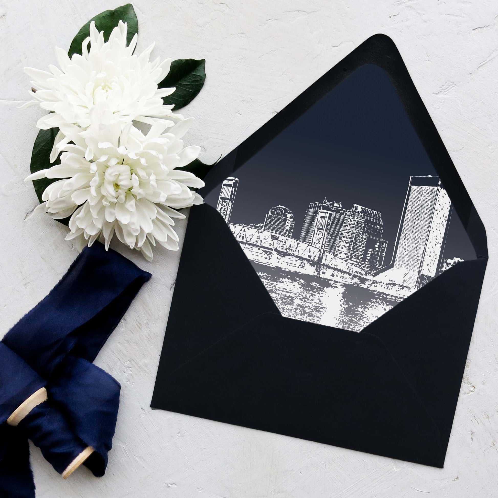 Invite your loved ones to join you under the city lights. The Jacksonville, Florida wedding invitation suite features the beautiful skyline from the waterfront. Wow your guests from the opening of the envelope with a beautifully hand-lined envelope.