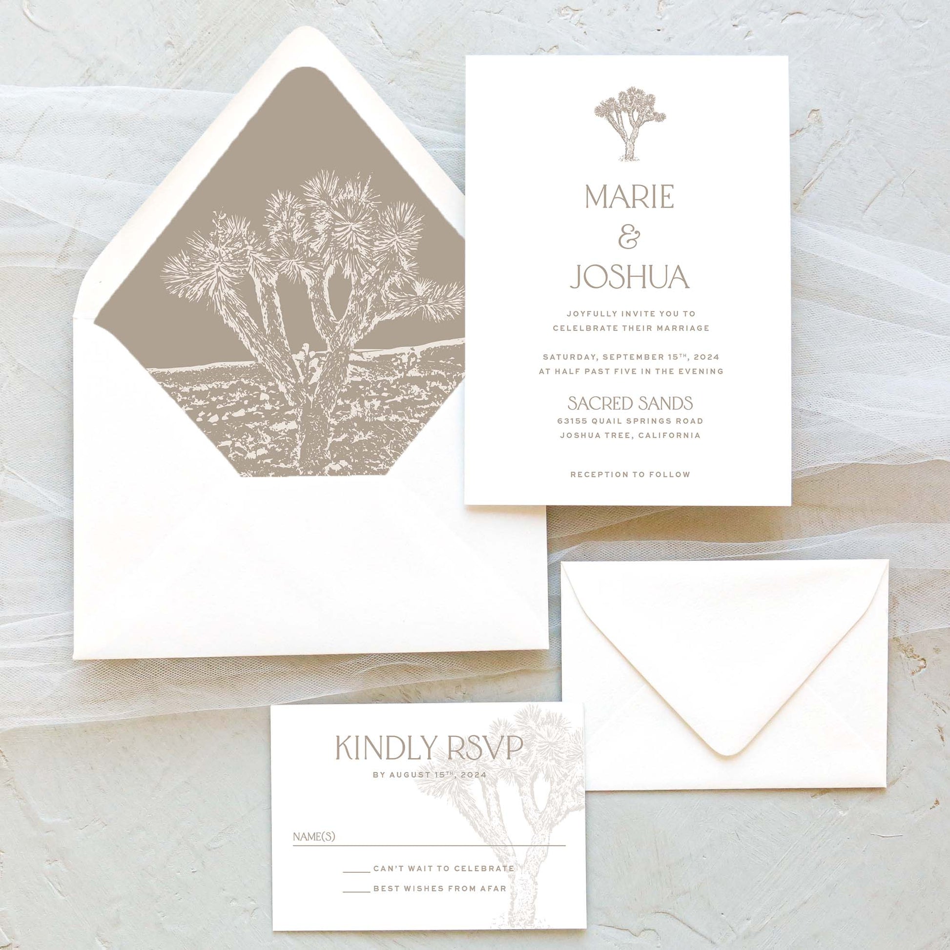 Invite your loved ones to share your celebration under the desert sky. The Joshua Tree wedding invitation suite is a classic and simple collection designed to reflect the unique charm of your upcoming wedding.