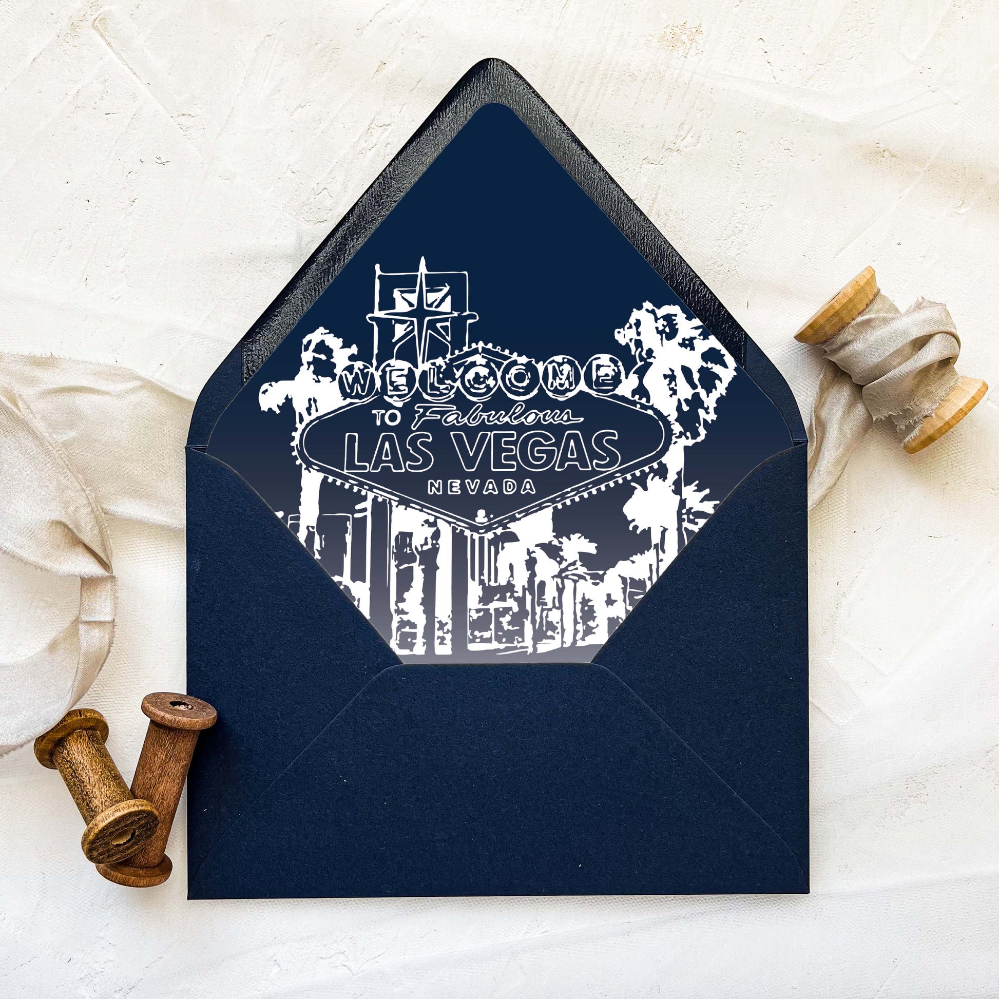 Sleek and sophisticated is this city invitation suite. The Las Vegas invitation suite is perfect for a destination wedding. Wow your guests from the opening of the envelope with a beautifully hand-lined envelope featuring the infamous Las Vegas Welcome Sign.