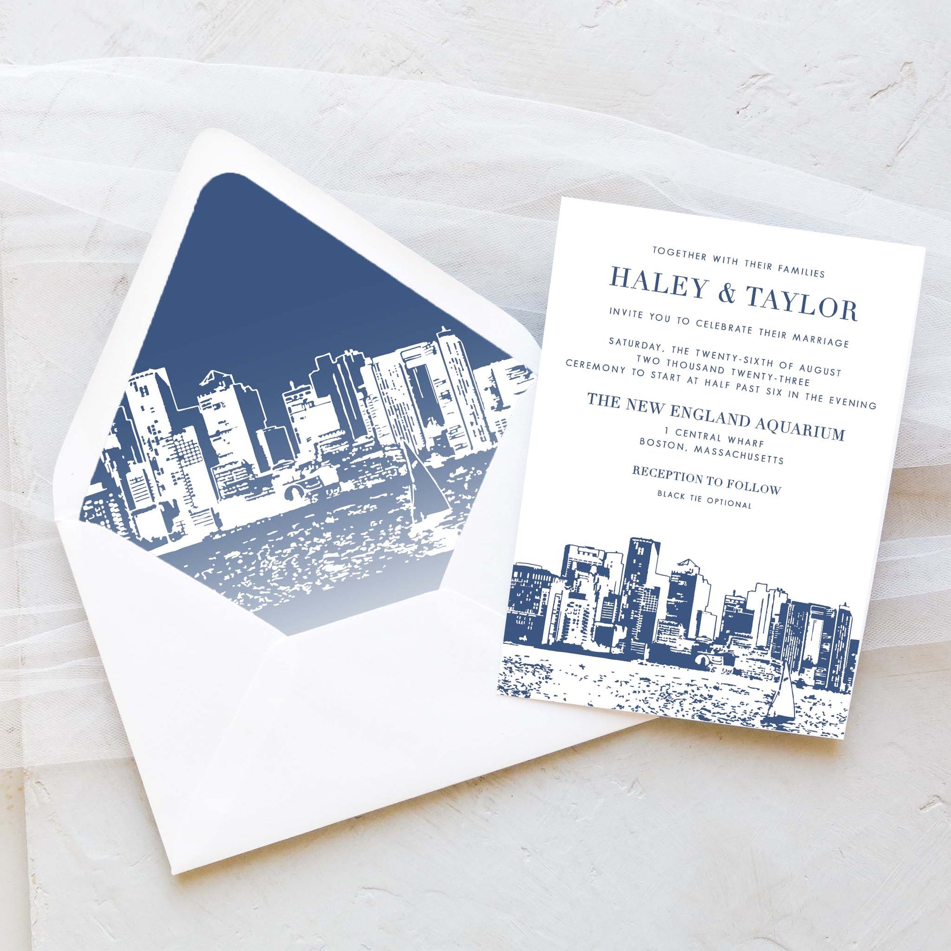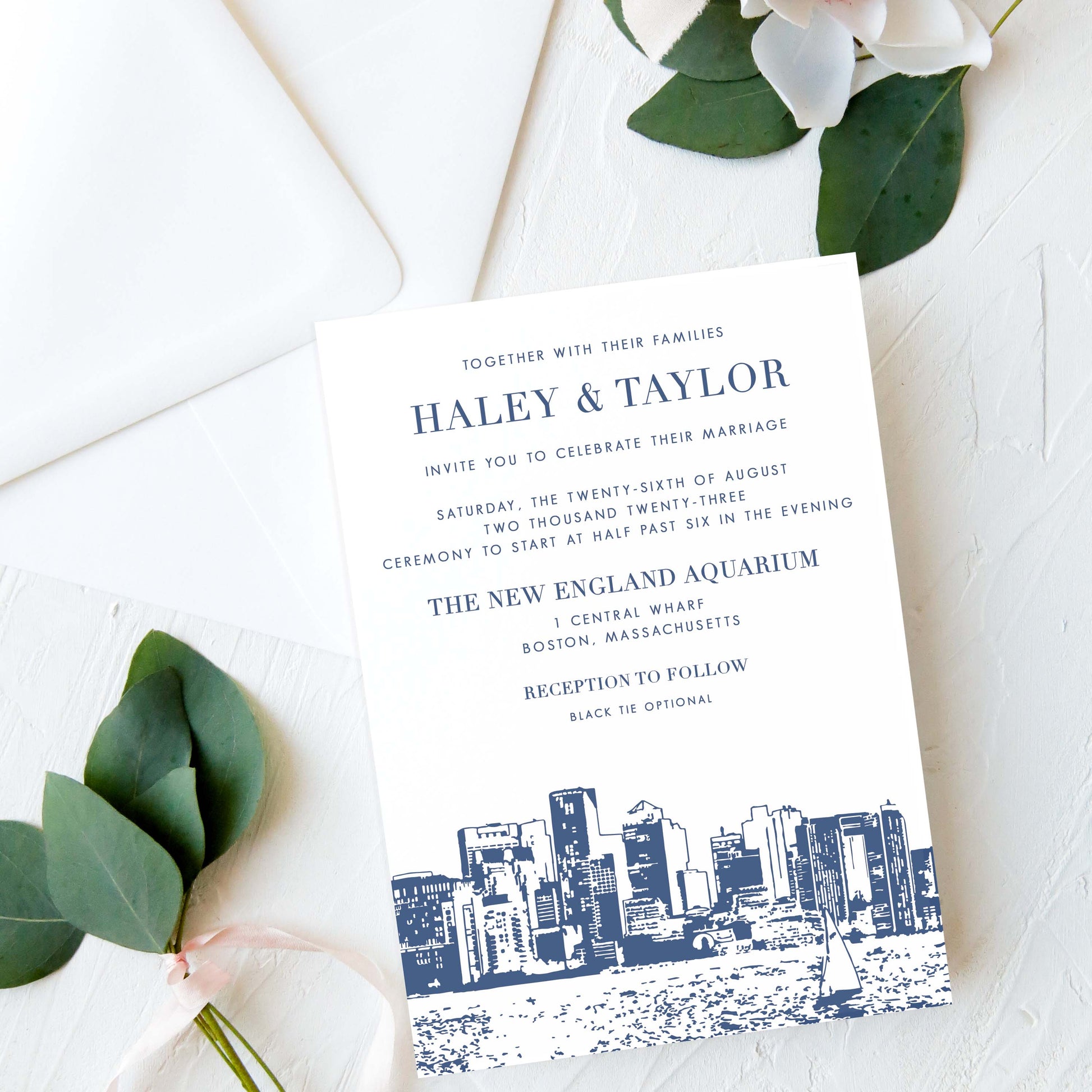 Celebrate your special day in style with our Boston Wedding Invitation. Featuring a beautiful skyline and serene waterfront scene complete with a sailboat, this invitation captures the charm and elegance of Boston. Bring your guests on a journey they won't forget with this unique and picturesque design.