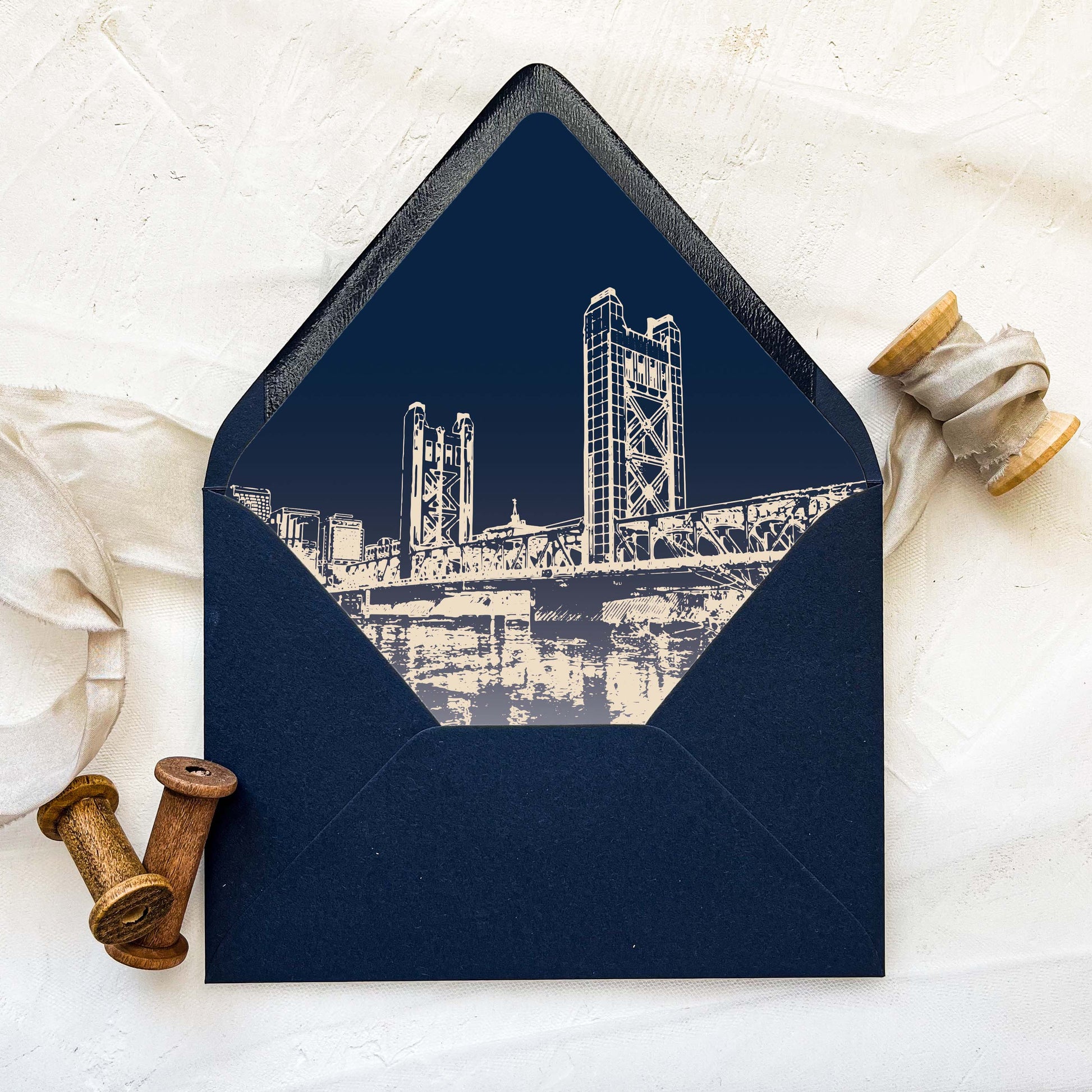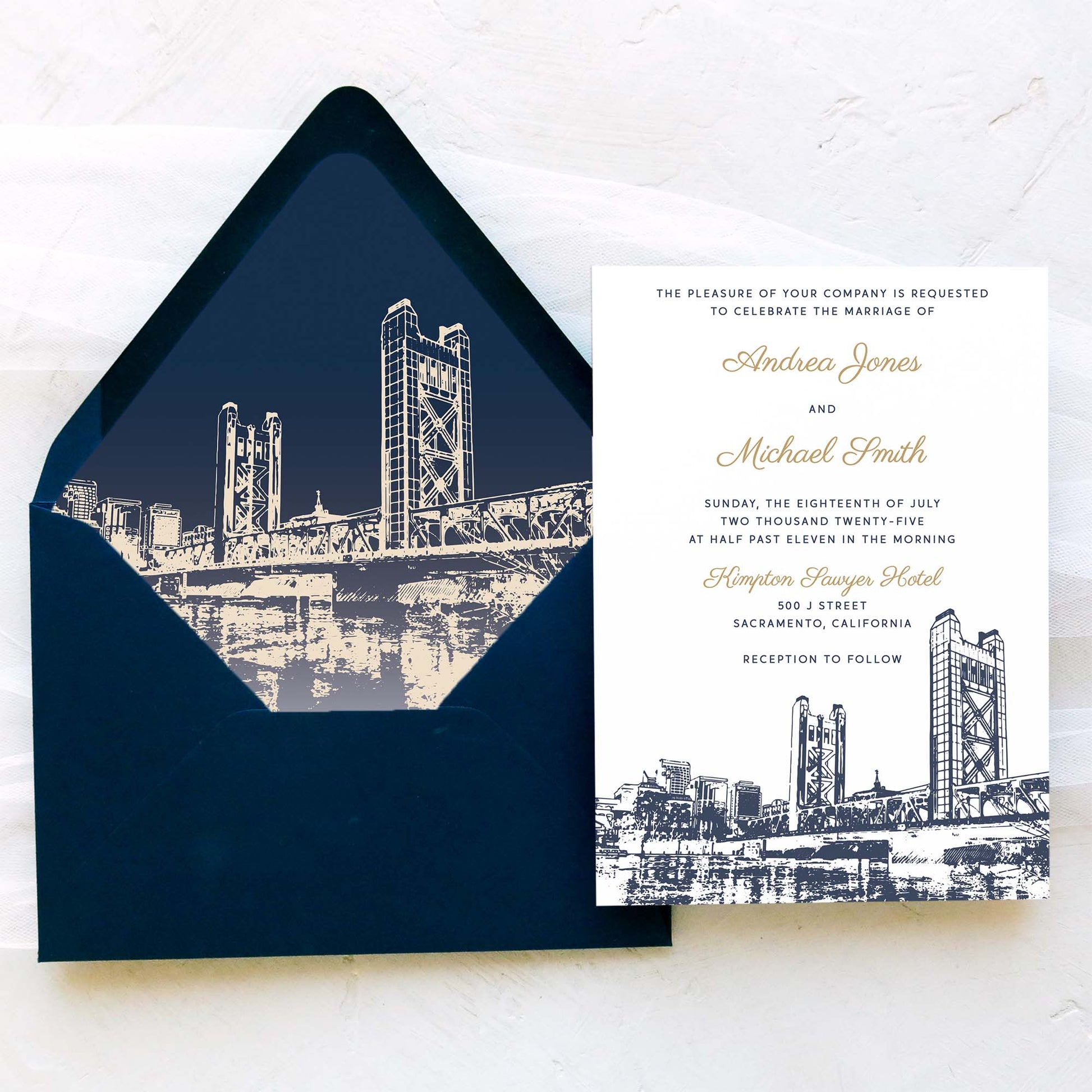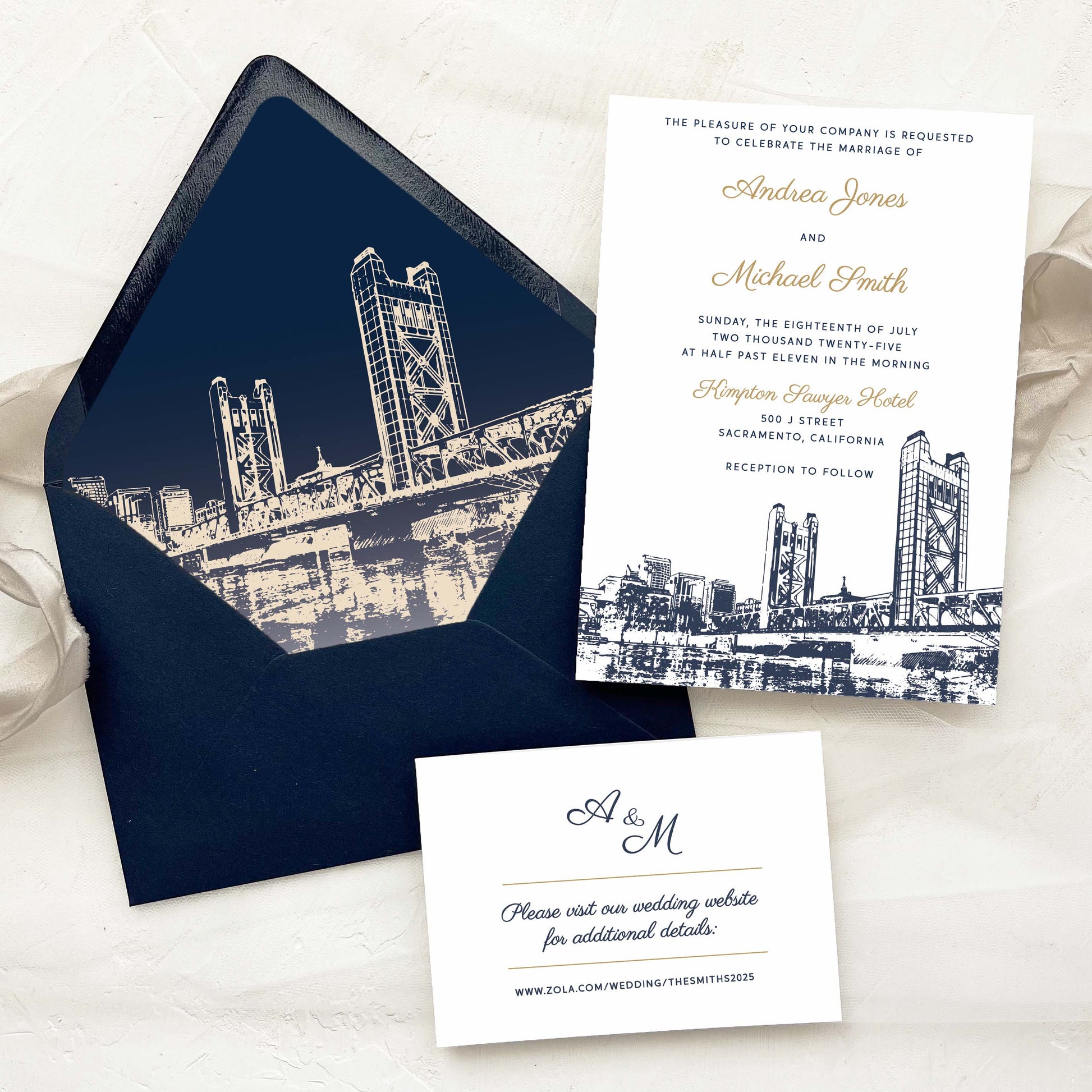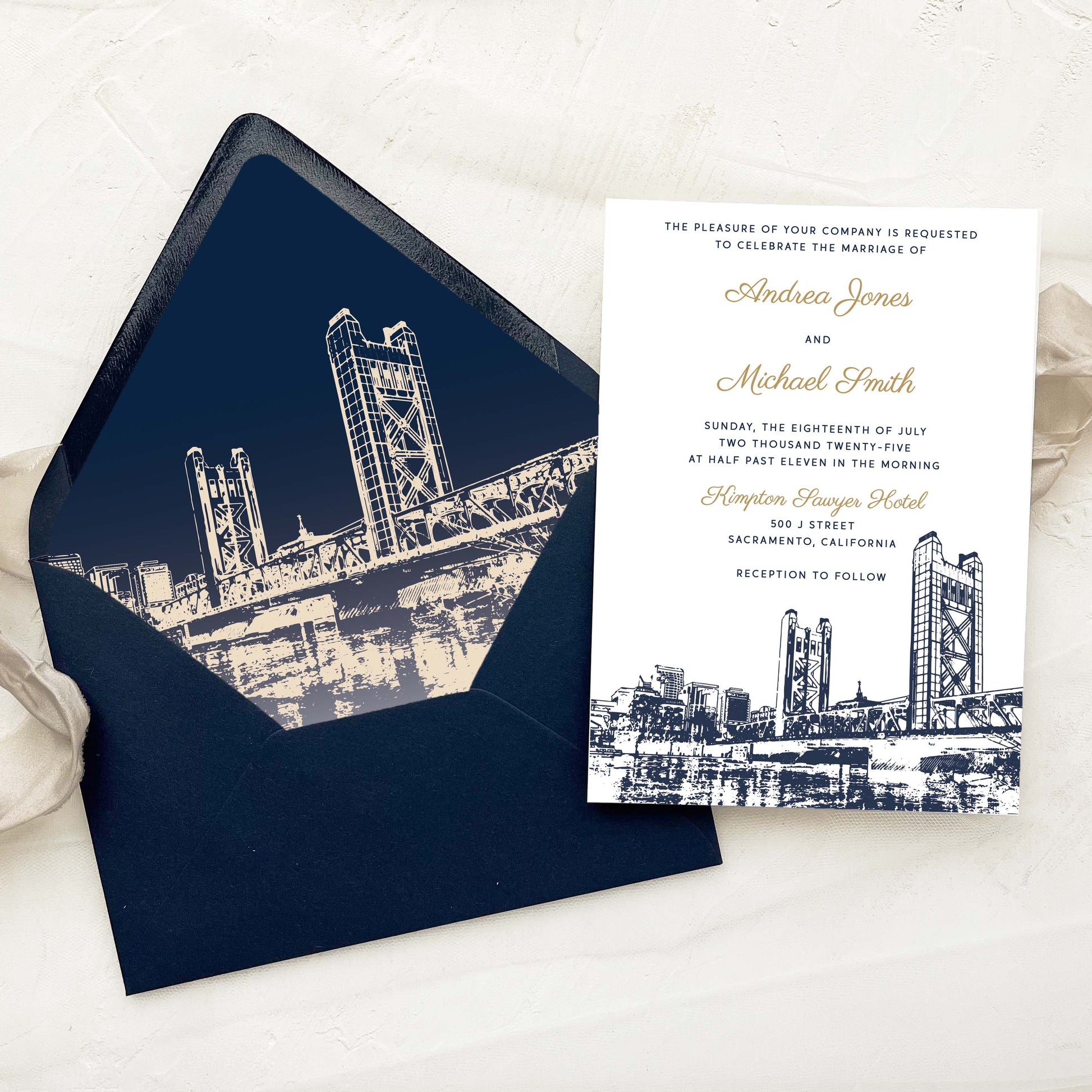 This Sacramento, California wedding invitation features the stunning Tower Bridge. Impress your guests and showcase your love for the city in a charming and elegant way. The Sacramento skyline invitation suite is a unique touch to your wedding theme.