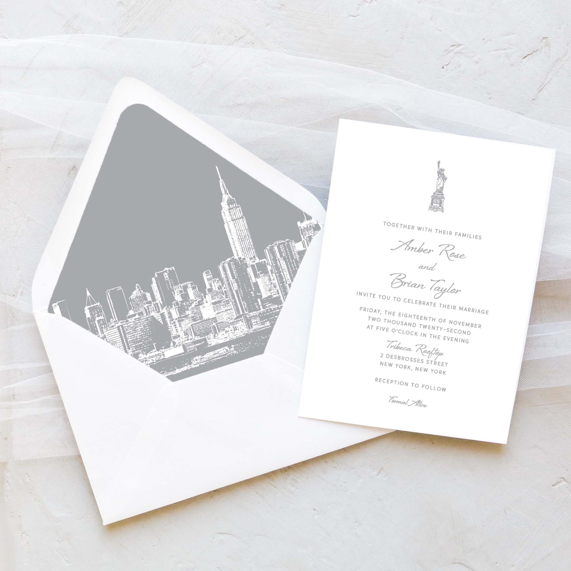 Invite your loved ones to join you under the city lights. The New York City wedding invitation suite features the Statue of Liberty on the card. Wow your guests from the opening of the envelope with a beautifully hand-lined envelope design of the New York City skyline showing the Empire State Building from the water.