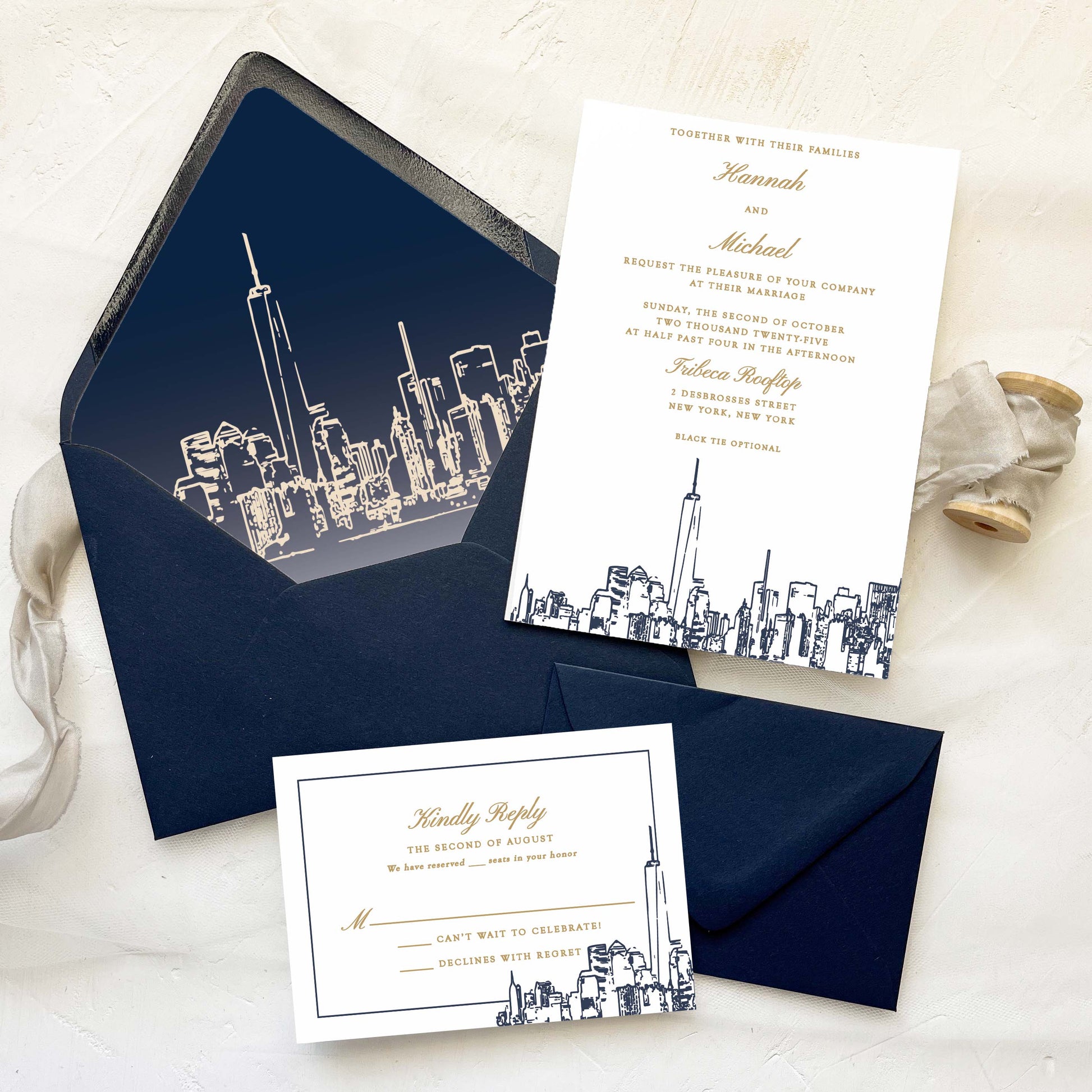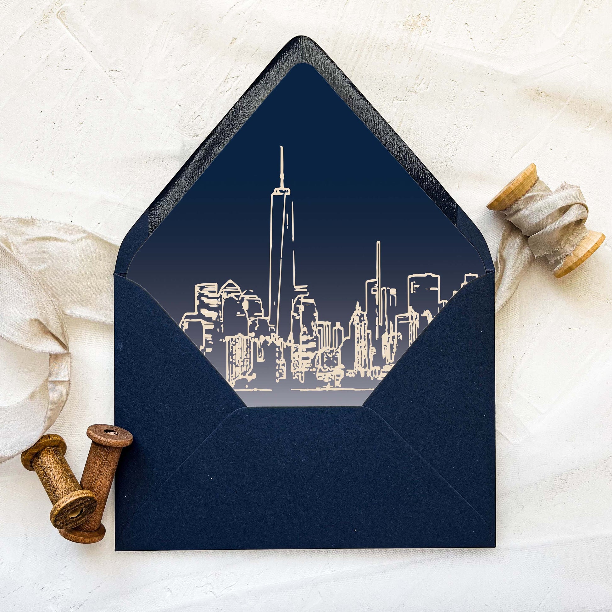 Invite your loved ones to join you under the city lights. The New York City wedding invitation suite features the iconic skyline on the card. Wow your guests from the opening of the envelope with a beautifully hand-lined envelope design of the New York City skyline showing the Freedom Tower from the water.