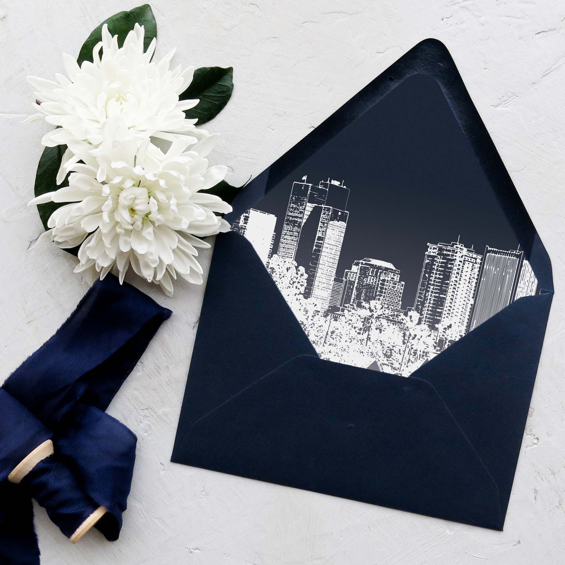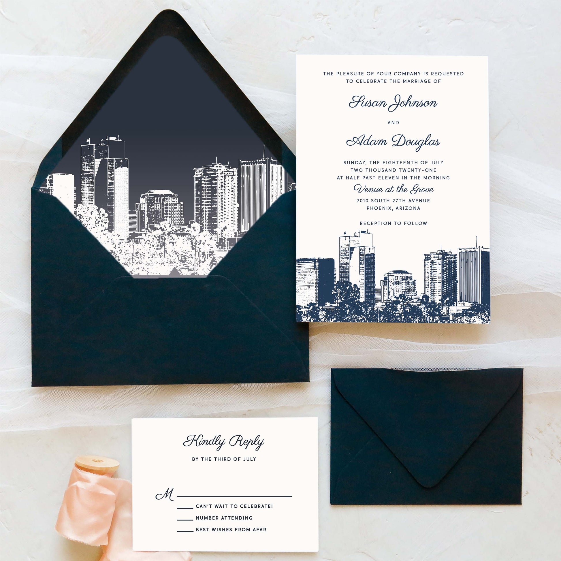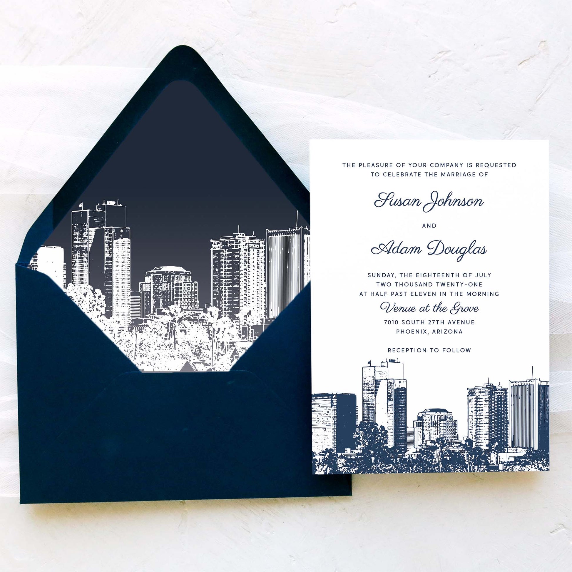 Invite your loved ones to join you under the city lights. The Phoenix, Arizona wedding invitation suite features the beautiful skyline. Wow your guests from the opening of the envelope with a beautifully hand-lined envelope.