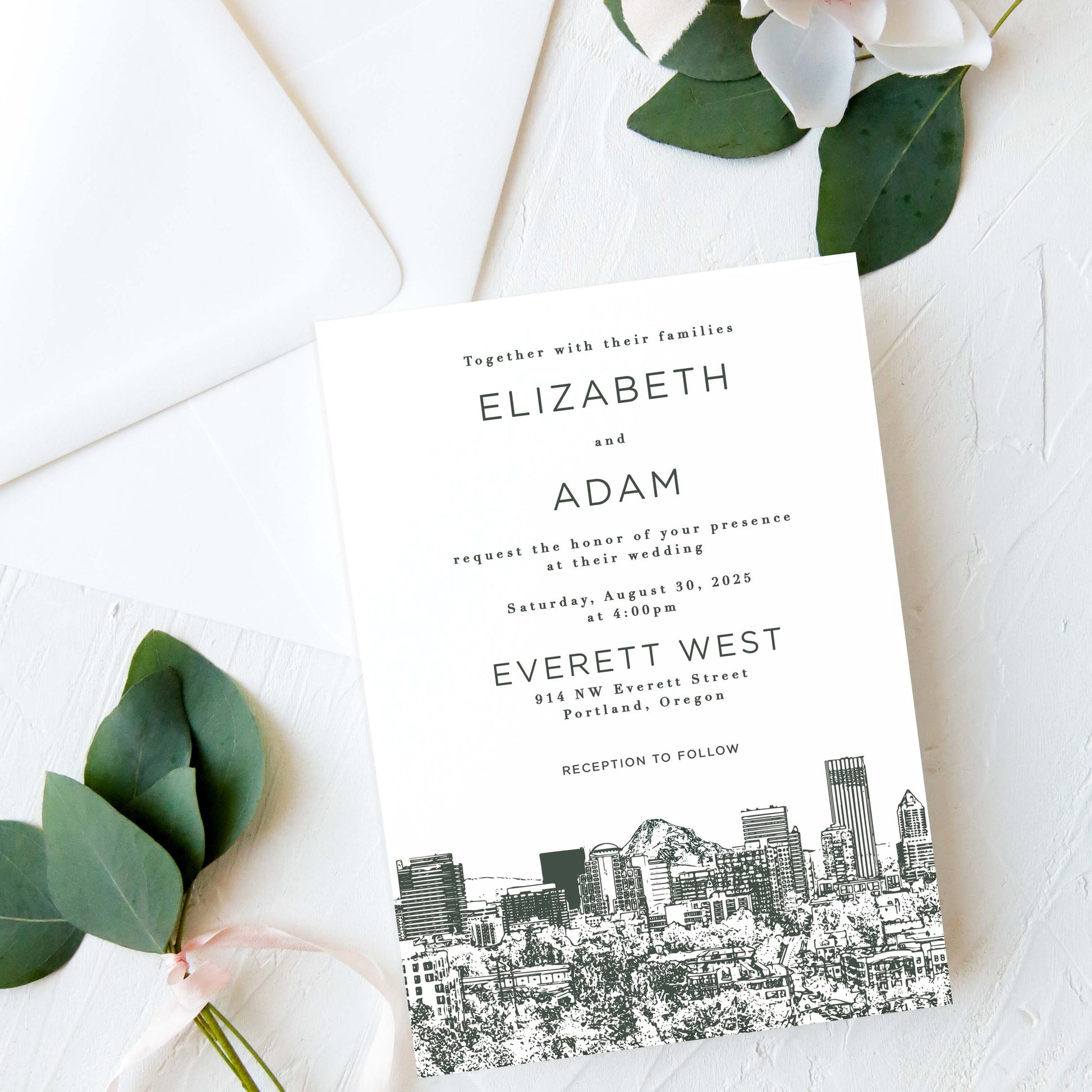 This Portland invitation beautifully merges the modern elegance of the city skyline with the breathtaking backdrop of the surrounding mountains, making it an ideal choice for weddings in the Pacific Northwest.