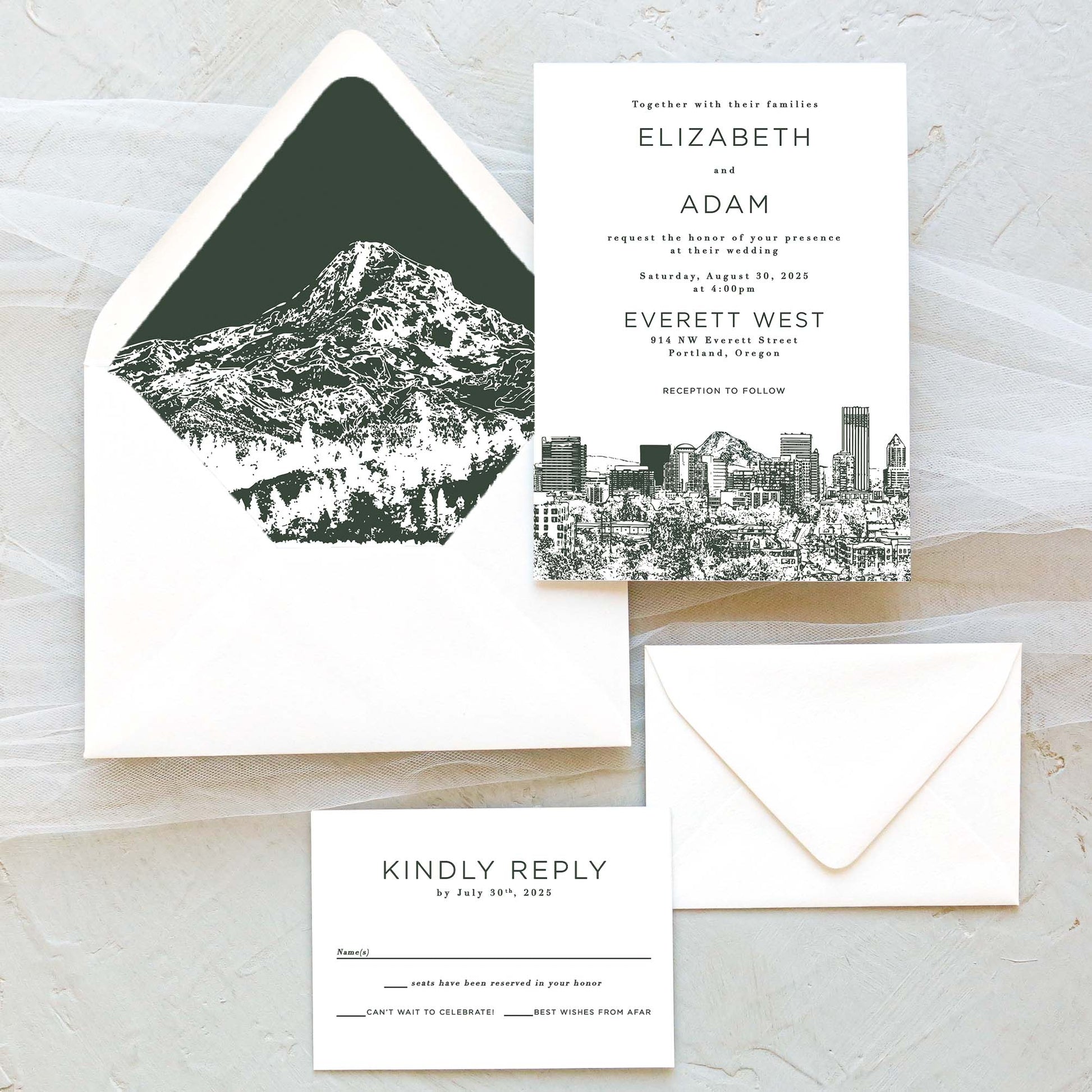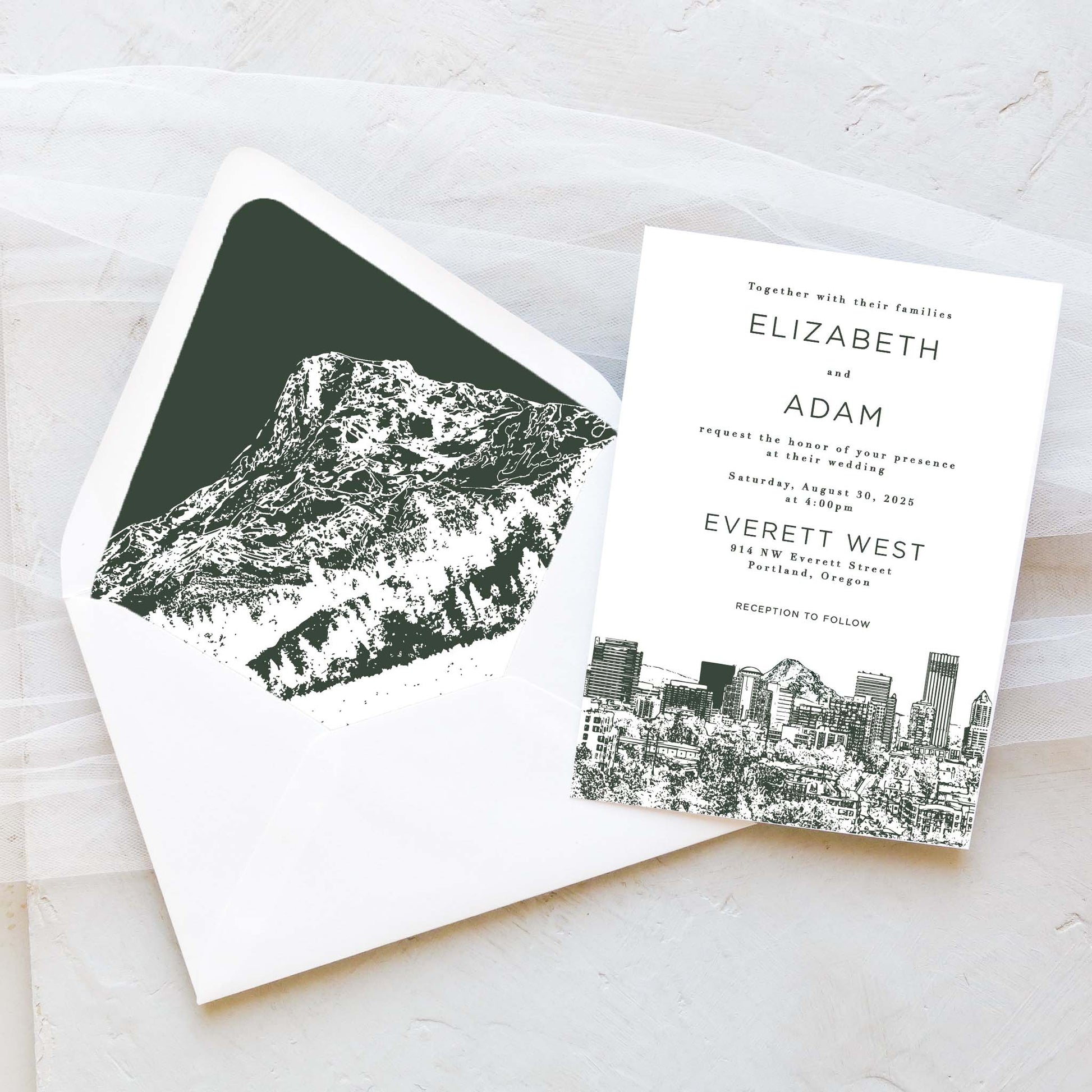 Invite your loved ones to join you under the city lights. The Portland, Oregon wedding invitation suite features the beautiful city skyline. Wow your guests from the opening of the envelope with a beautifully hand-lined envelope showcasing Mt Hood.